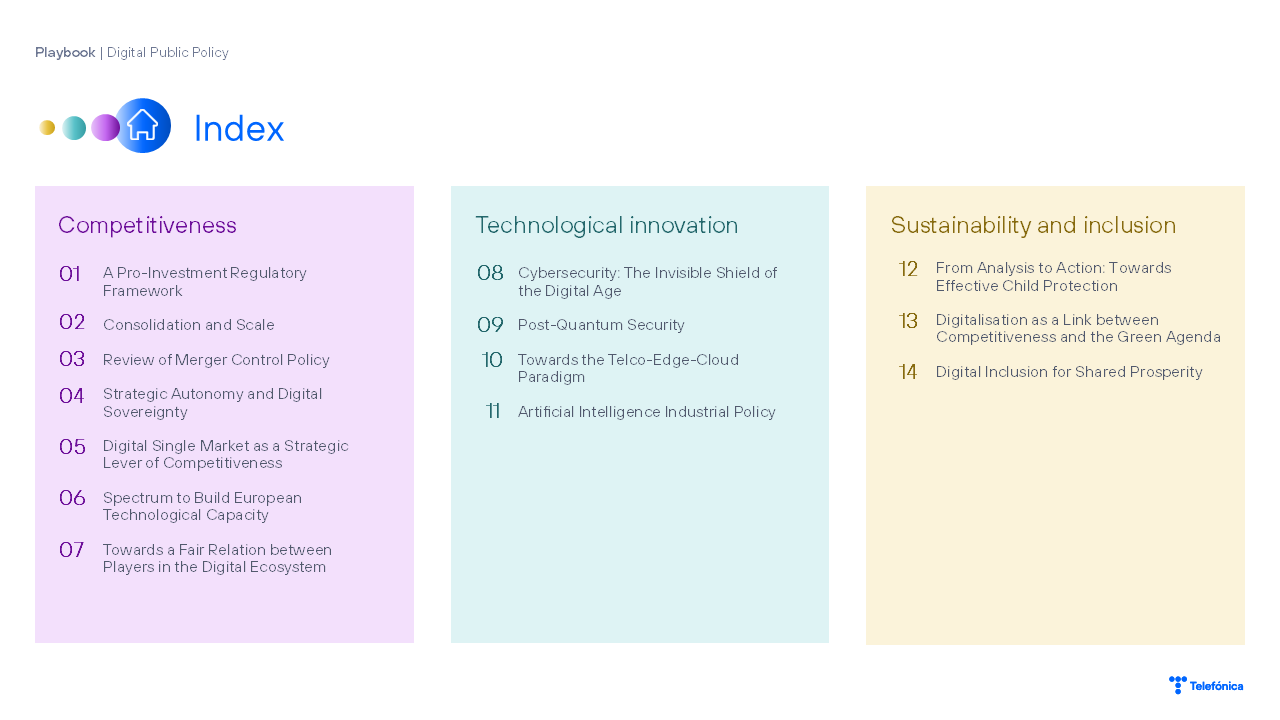 This new edition comprises 14 topics identified as the main public policy debates and trends of the year in the digital sphere. Some of these were already present in the previous edition and have been updated; others are new and respond to emerging realities. They have been categorised around three pillars that articulate our vision and proposals in response to key challenges: competitiveness, technological innovation, and sustainability and inclusion.