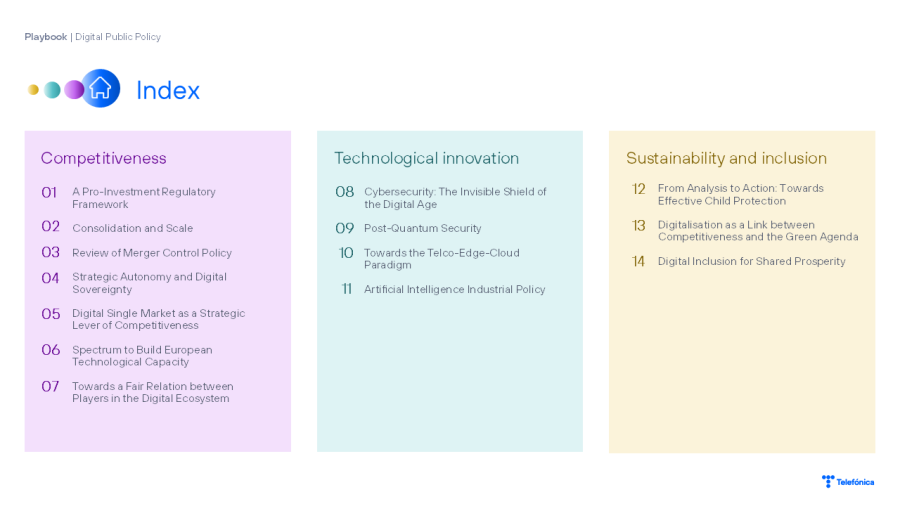 For the second consecutive year, Telefónica is publishing its Digital Public Policy Playbook. This document brings together in one place Telefónica’s vision and proposals to contribute to the design of public policies that will enable progress towards a more competitive, innovative and sustainable Europe.