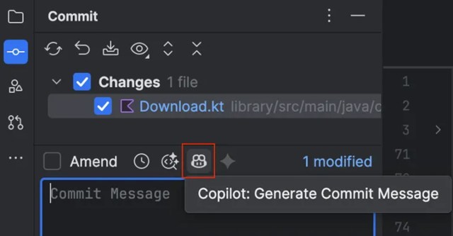 In this window, the GitHub Copilot icon appears. Hovering over it shows the option “Generate Commit Message”. When clicked, Copilot automatically generates a commit message based on the configured instructions and the current changes.