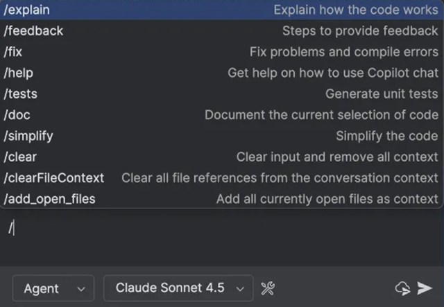 The GitHub Copilot plugin for Android Studio already includes several built-in prompts. Simply typing / in the chat displays the list of available commands.