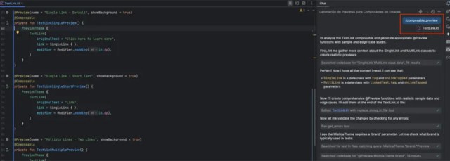 These prompts can be executed using context files, such as files containing composables. When running the command in agent mode, Copilot automatically generates the previews following the instructions defined in the prompt.
