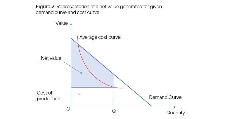 The foundation for the calculation of welfare is the demand curve. Assuming that value can be proxied by willingness to pay, the demand curve represents the value attached by consumers to each unit of product or service consumed. The curve is generally depicted as downwards sloping, to account for the fact that as consumption increases, a lower value is attached to each additional unit consumed [1].