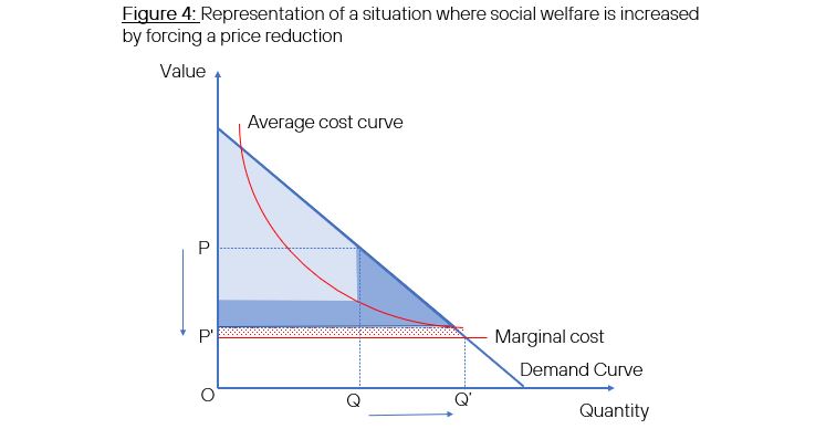 In the very short term, in which the value for consumers and the production means are given, the most immediate way to increase total welfare is to induce an increase in usage through a reduction in prices. A benevolent regulator could try to estimate the cost of producing an additional unit (the “marginal cost”) and cap prices at that level (see figure 4 below).