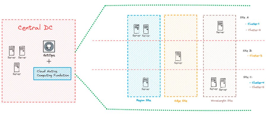 In the figure, you can see multiple Kubernetes clusters running digital twins in various zones, providing on-demand clusters and managed from a single central point (central DC). And all of this is declared in YAML format files with versioning and control of every change made to the platform.