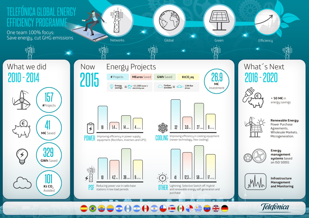 In the period 2010-2014 Telefónica has developed 157 energy efficiency projects and 102 is ongoing in 2014-2015 all around its footprint and it has save 136 GWh and 36 kt CO2 eq only in 2015. Besides 15% of the Telefonica energy comes from renovables sources.