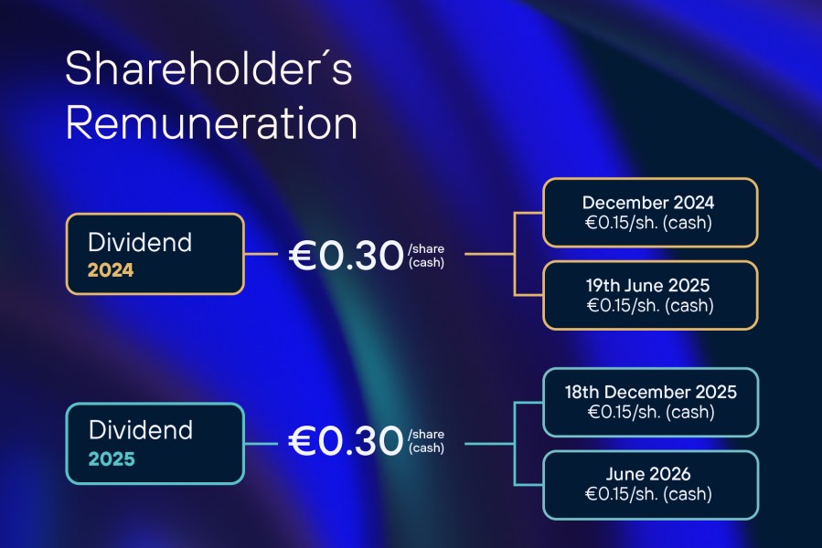 - Telefónica confirms a cash dividend of €0.30 per share for 2025, payable in two tranches: the first next December (€0.15) and the second in June 2026 (€0.15). Also, the second tranche of the dividend for 2024, also of €0.15 per share in cash, will be distributed on 19 June.
