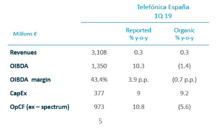 Telefónica today presented its financial results for the first quarter of 2019, showing an improvement in its growth trend, both in terms of revenue, net income and earnings per share. In addition, free cash flow has multiplied by 2.6 times compared to the first quarter of 2018, which allows accelerating the reduction of debt (-693M € in the quarter, around € -1.7bn additionally, including events after 31 March).