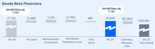 Los pagos de intereses: +5,5% interanual hasta 1.015M€ en 2025, pese a los ahorros relacionados con deuda en real brasileño, que no compensan los gastos extraordinarios de 2024. El coste efectivo de la deuda (últimos doce meses) disminuye hasta 2,98% a diciembre 2025 (Dic-25: 3,19%).