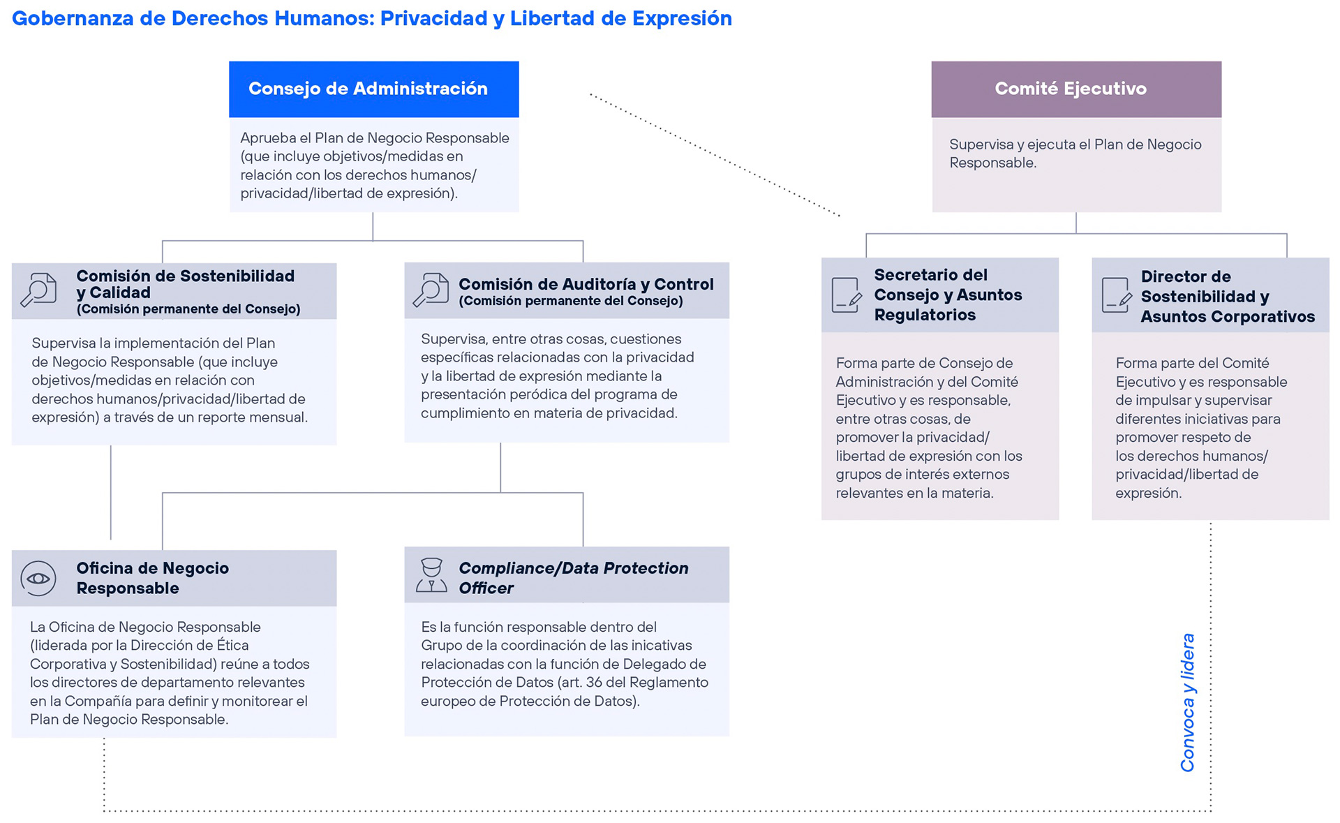 Para garantizar la protección y promoción de los derechos humanos, hemos establecido un modelo de gestión de responsabilidades claras en la protección de los derechos humanos en general y en la privacidad y la libertad de expresión en particular.