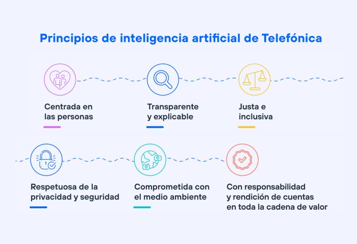 Telefónica aprobó unos principios éticos para la IA de aplicación en toda la compañía. Estos principios se aplican desde el diseño y abarca su desarrollo incluyendo el uso de productos y servicios por parte de los empleados de la compañía, así como los proveedores y terceras partes.