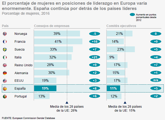 Este convencimiento es clave ya que, según McKinsey, para acelerar el cambio, es necesario que los responsables empresariales muestren su compromiso de manera visible y sostenida en el tiempo, para asegurar que se asientan nuevos modelos. Y es que queda patente que progresar no es nada fácil: el informe muestra que los planes de igualdad obligatorios para firmas de más de 250 empleados no parecen funcionar. Más del 60% de las compañías invierten en ellos, pero solo el 17% logran avances, según la consultora.