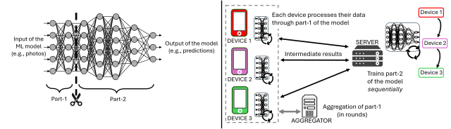 En la figura de arriba (derecha) se representan los pasos del flujo de trabajo de procesamiento de SFL para 3 dispositivos. Al principio de cada ronda de formación, los dispositivos procesan una parte (lote) de sus datos a través de la parte-1 del modelo, envían los resultados intermedios al servidor, el servidor forma secuencialmente la parte-2 basándose en los resultados recibidos de cada dispositivo y envía los resultados a los dispositivos, y finalmente los dispositivos actualizan sus modelos locales. Estos pasos se repiten para todos los lotes, y una vez que todos los dispositivos han procesado todos sus datos, todas las actualizaciones del modelo se combinan en un modelo global (por el agregador), antes de que comience una nueva ronda.