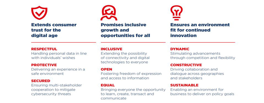Los principios de esta declaración digital instan a las empresas a: respetar la privacidad de los ciudadanos digitales; tratar los datos personales de forma segura y transparente; tomar las medidas adecuadas para mitigar las amenazas en Internet y garantizar que todo el mundo pueda participar en la economía digital a medida que se desarrolla, así como a combatir el acoso en línea. En conjunto, estos compromisos garantizarán que Internet se mantenga como una plataforma abierta para la expresión y un impulsor de innovación.