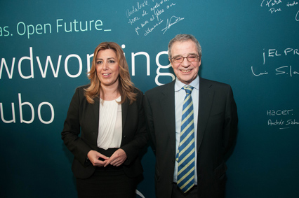 Sevilla, 2 de diciembre de 2014.- Susana Díaz presidió, junto a César Alierta, la firma del convenio impulsado por la Junta y Telefónica, y visitó El Cubo, un espacio innovador para proyectos de emprendedores