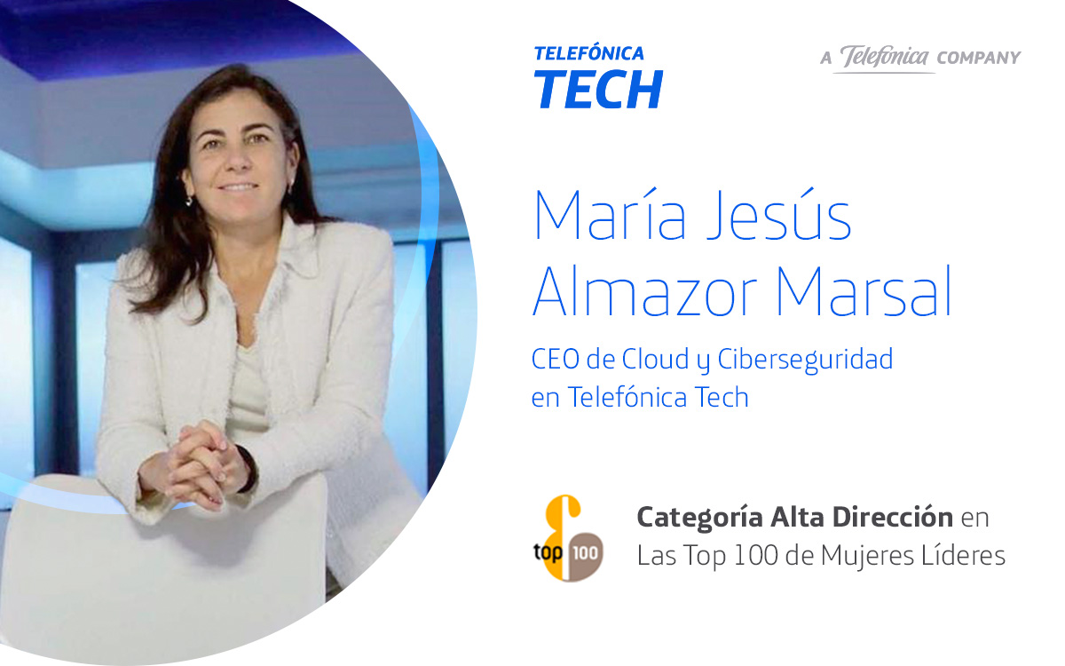Madrid, 21 de abril de 2021. María Jesús Almazor, CEO de Cloud y Ciberseguridad de Telefónica Tech (el holding de negocios digitales de Telefónica), ha sido elegida hoy como una de las ‘Top 100 Mujeres Líderes en España’. El objetivo de este ranking, impulsado por la revista Mujeres&cia, es “hacer cada vez más visibles a mujeres notables en sus ámbitos de actuación y que sus voces se escuchen en los centros de poder, donde se deciden las cosas que importan”.