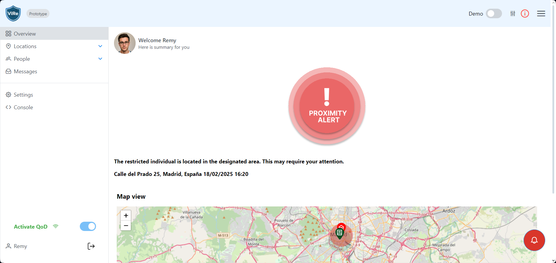 ViRe es una aplicación móvil multi-operador que informa en tiempo real a las personas protegidas por órdenes de alejamiento de la proximidad de aquellos individuos identificados como potencialmente peligrosos, garantizando en todo momento un entorno seguro a las víctimas. La aplicación también alerta a las fuerzas del orden y, opcionalmente, a las personas seleccionadas por la víctima, como familiares, amigos o compañeros de trabajo, ofreciendo así una protección adicional. Asimismo, permite catalogar lugares concretos como seguros y verificar el estado de espacios públicos independientemente de las fronteras, ya que se basa en API universales estándar y funciona en todos los países. También puede configurarse para vigilar lugares relacionados con la víctima, aunque ésta no se encuentre físicamente en ellos, como su domicilio o lugar de trabajo.