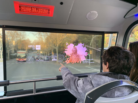 Barcelona, 4 de marzo de 2020.- El Grupo Mediapro, Telefónica y Transports Metropolitans de Barcelona (TMB) han desarrollado el primer proyecto de realidad aumentada 5G que permite a los pasajeros de un autobús turístico visualizar contenidos inmersivos en la ventana delantera del vehículo, de manera superpuesta al paisaje o los monumentos que observan mientras realizan un tour.