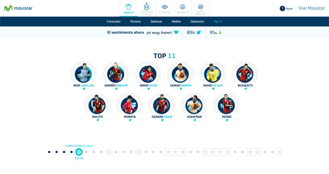 Consciente de que lo que hace grande a la selección no son solo sus jugadores sino también su afición, movistar pone a disposición de todos los aficionados esta herramienta a partir del 13 de junio, desde la que ofrece también contenidos exclusivos como una ficha de cada jugador, el top 11 o un comparador de jugadores y una selección de aquellos que generen más sentimiento en las Redes Sociales.
