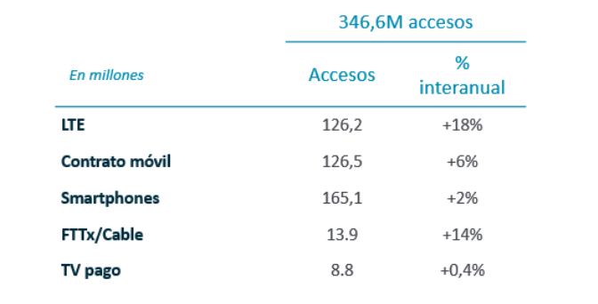 La base de accesos de Telefónica se sitúa en 346,6M a junio de 2019 y continúa ganando en valor, con un crecimiento del ingreso medio por cliente del 4,4% interanual orgánico y un churn estable. Se mantiene así el foco estratégico en clientes de valor, que continúan manteniendo un crecimiento sólido.