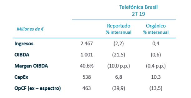 Por otra parte, la evolución de los tipos de cambio tiene un impacto negativo en los resultados reportados de la Compañía, principalmente por la depreciación frente al euro del peso argentino y del real brasileño, si bien la tendencia mejora secuencialmente. Así, en el segundo trimestre de 2019 las divisas reducen en 4,1 p.p. el crecimiento interanual de los ingresos y en 3,6 p.p. el del OIBDA. Sin embargo, el impacto negativo de la depreciación de monedas a nivel OIBDA (-322M€ en el primer semestre de 2019) se reduce significativamente en términos de generación de caja (-91M€). Además, los resultados se encuentran afectados en el semestre por la salida del perímetro de consolidación de T. Nicaragua (desde 1 de mayo 2019), T. Guatemala (desde 1 de enero de 2019) y Antares (desde 1 de febrero de 2019).