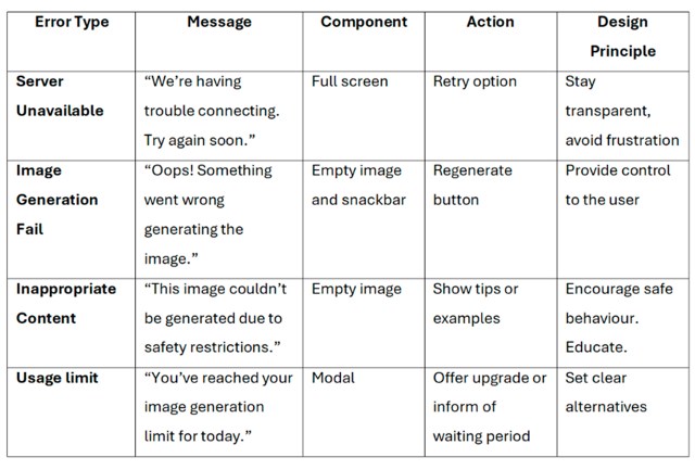 La tecnología puede fallar, se pueden alcanzar límites de uso o los procesos de generación de imágenes pueden experimentar problemas. Es esencial informar a los usuarios cuando se producen estos errores, pero lo que es más importante, proporcionar acciones para hacer en esos casos. A continuación, se muestran algunos ejemplos de errores, que como se puede ver, pueden diseñarse y refinarse de manera diferente según la situación para ofrecer una mejor experiencia.