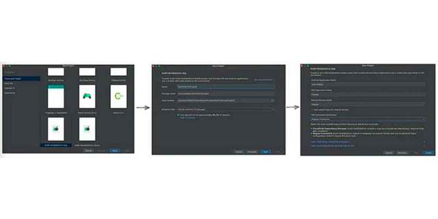 En primer lugar, abre Android Studio y selecciona crear una aplicación Kotlin Multiplataform. Y en la siguiente pantalla, selecciona distribución de marco de trabajo IOS a marco de trabajo regular.