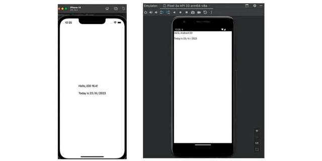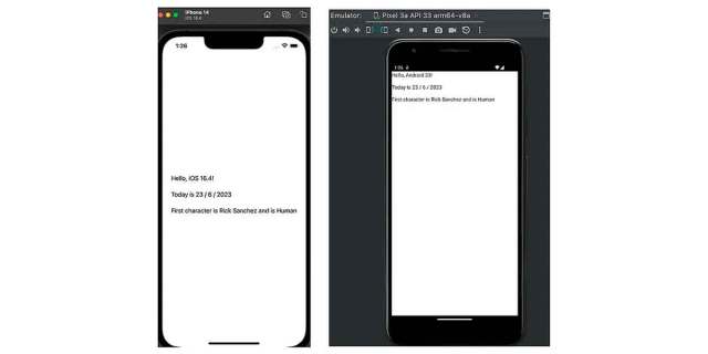 Concretamente, en este proyecto se ha añadido cierta lógica común en el módulo compartido para construir un saludo con código específico de la plataforma en el módulo compartido. Y luego has añadido código específico de la plataforma para implementar la interfaz de usuario (IU) en ambas plataformas: Android e iOS.