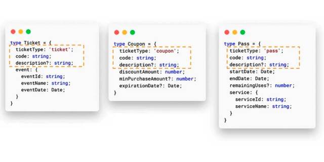 type Ticket = EventTicket | Coupon | Pass; Hasta aquí, todo bien.