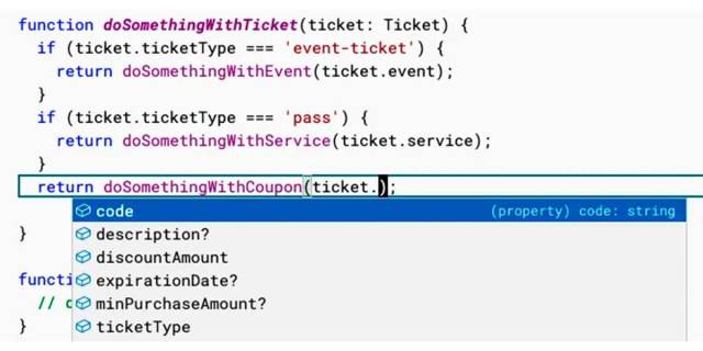 En la tercera rama – hemos comprobado event-ticket y pass, por lo que la input Ticket es un Coupon – VsCode infiere el tipo de Coupon correctamente: